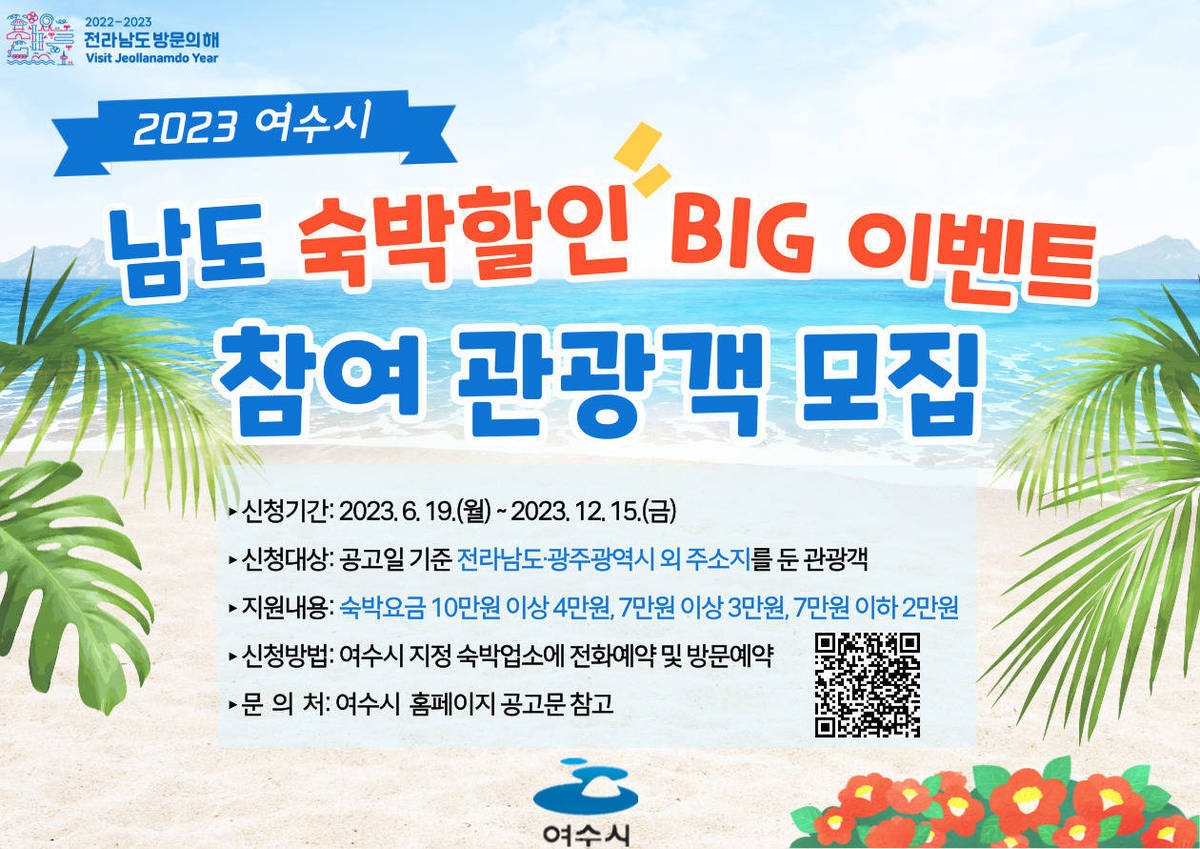 ‘남도 숙박할인 빅(BIG) 이벤트’는 광주광역시·전라남도 외 주소지를 둔 관광객(단체 및 외국인 포함)이 여수시 숙박업소를 이용할 경우 숙박비 일부를 할인해주는 사업이다.